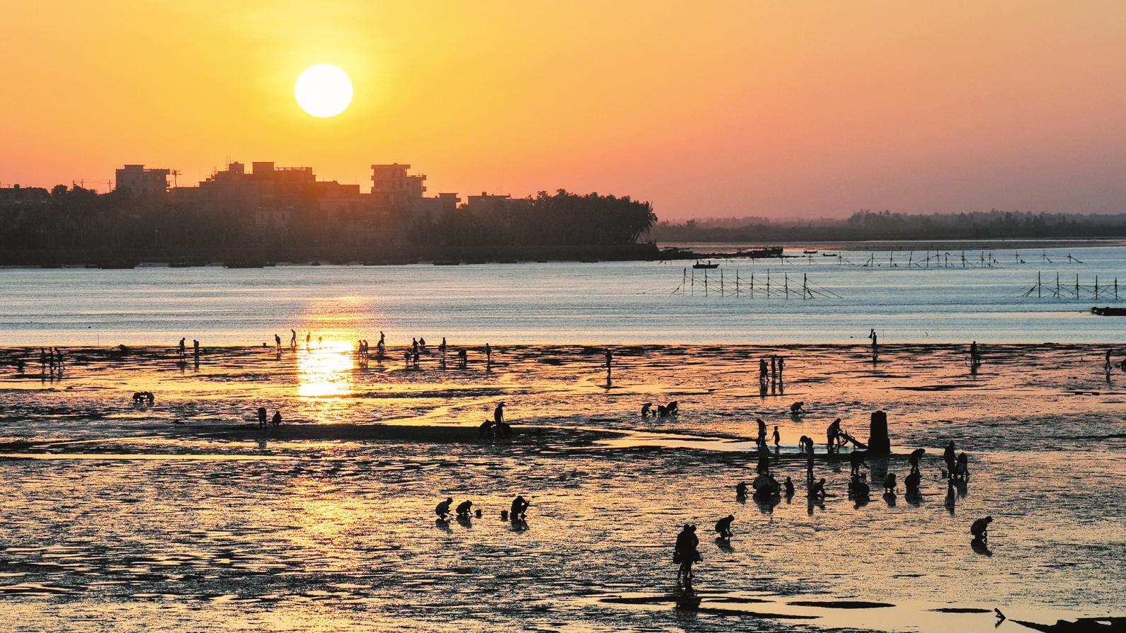 近日,在??谑忻捞m區(qū)演豐鎮(zhèn)北港島,朝陽將灘涂染成金色。一大早,不少市民游客手提小桶、腳踩灘涂、彎腰拾貝,勾勒出一幅生動的趕海畫卷。