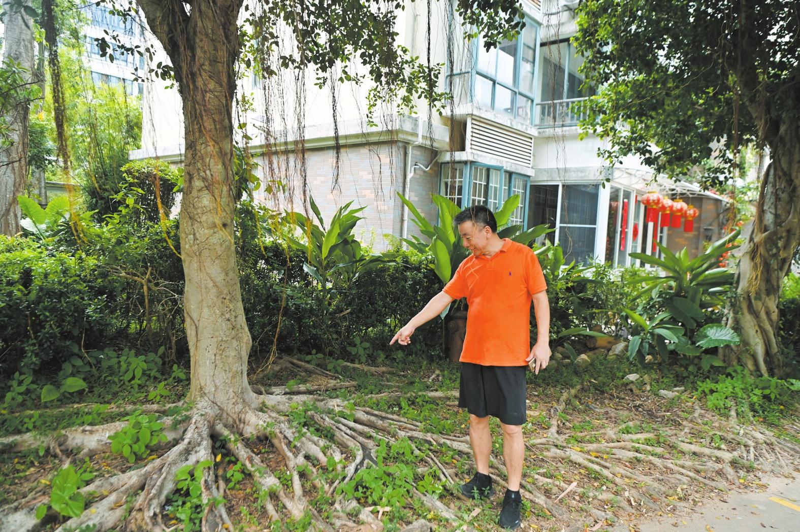 觀瀾公寓小區(qū)13A棟業(yè)主顏先生向記者講述榕樹(shù)根系帶來(lái)的煩惱。記者 石中華 攝
