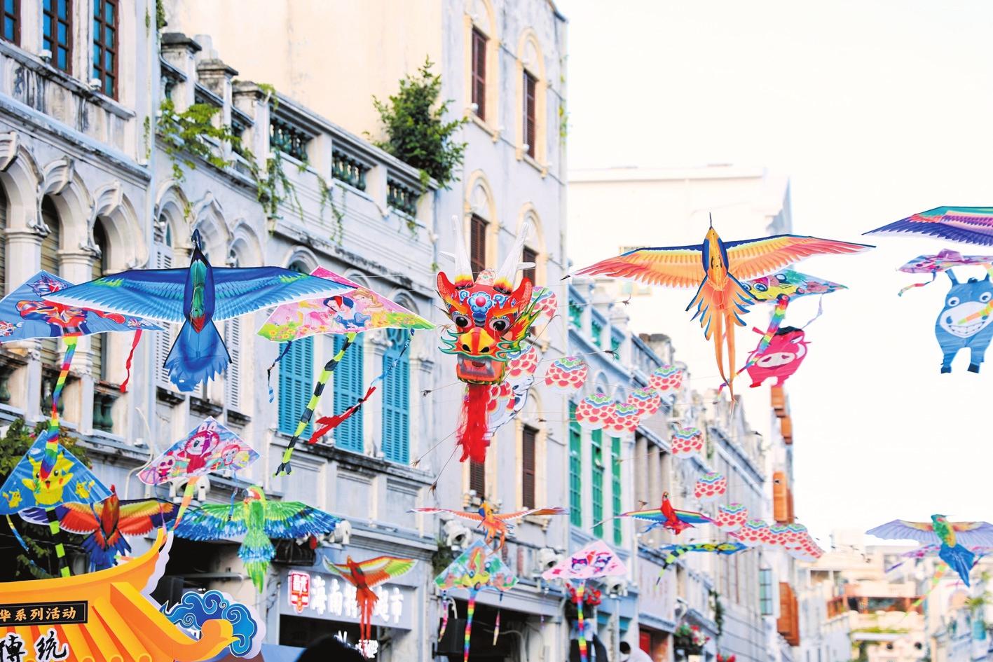 近日,“中國傳統(tǒng)風箏文化展”走進海口騎樓老街。圖為各具特色的風箏“飛舞”,吸引市民游客駐足欣賞。(組委會供圖)