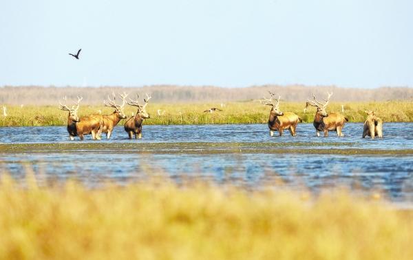 11月28日,在位于南洞庭湖區(qū)的沅江市,6只麋鹿在陳家湖的湖洲上覓食棲息。初冬的暖陽(yáng)下,麋鹿與越冬候鳥和諧共處,構(gòu)成一幅生動(dòng)的生態(tài)畫卷。(鐘祖彪 黃曦 攝影報(bào)道)