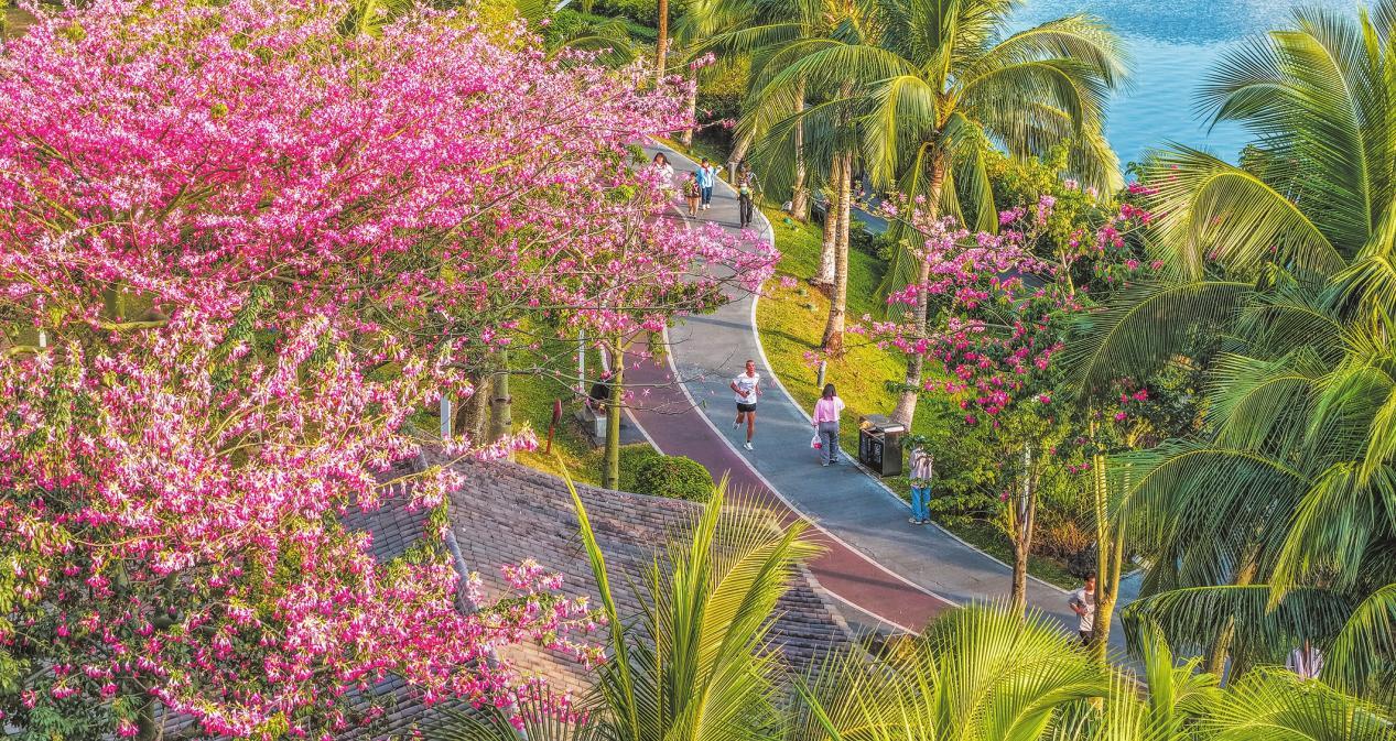 近日,??诩t城湖公園的異木棉進(jìn)入盛花期,滿枝花色絢麗,與椰林、湖岸相映成趣,為冬日添了一筆暖色,也為步道增添了浪漫氛圍。市民游客在其中或慢跑健身、或漫步賞花,一幅人與自然和諧相處的動(dòng)人畫卷在椰城鋪開。(記者 康登淋 攝)