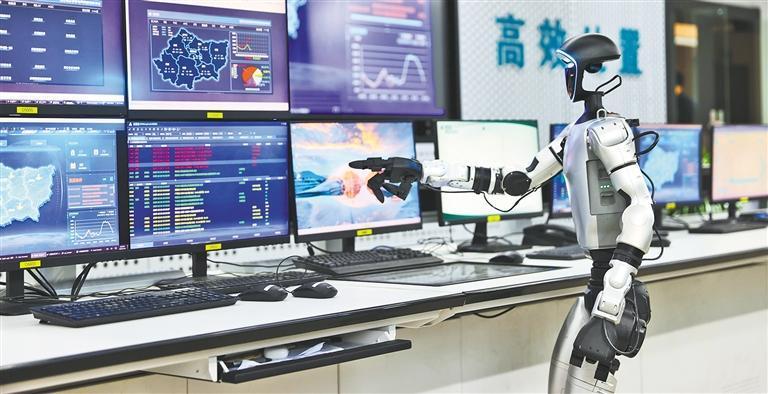 位于湖北省襄陽市的國網(wǎng)襄陽供電公司江北集控站監(jiān)控大廳內,人形機器人專注“盯屏”。它能自動生成故障處置建議,遇到緊急情況還能自主撥打通知電話,讓事故分析從15分鐘縮短到秒級,故障處置準確率提升70%以上。王虎攝(中經(jīng)視覺)