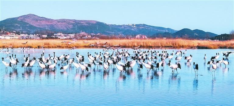 冬日,地處貴州省畢節(jié)市威寧縣的草海國家級自然保護(hù)區(qū)呈現(xiàn)萬鳥翔集的生態(tài)美景,黑頸鶴、灰鶴以及斑頭雁等大批候鳥來此越冬。新華社記者 楊文斌