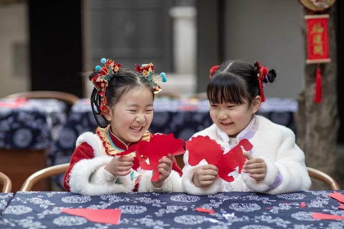 2月2日,在江蘇省興化市昭陽街道的畢飛宇工作室內(nèi),興化市昭陽湖幼兒園的孩子們在老師的指導(dǎo)下創(chuàng)作以生肖馬為主題的剪紙。