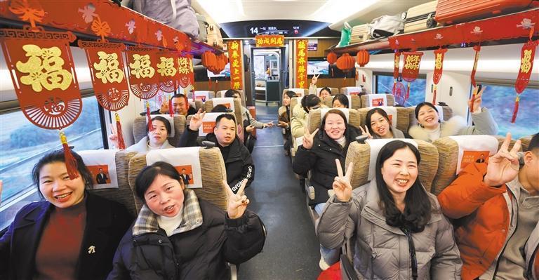 2月19日,務(wù)工旅客在G4840次務(wù)工定制高鐵專列上合影。王超攝(中經(jīng)視覺(jué))