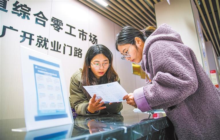 2月27日,浙江省湖州市德清縣阜溪街道綜合零工市場(chǎng)大廳,工作人員向求職者介紹靈活就業(yè)相關(guān)信息。王樹成攝(中經(jīng)視覺(jué))