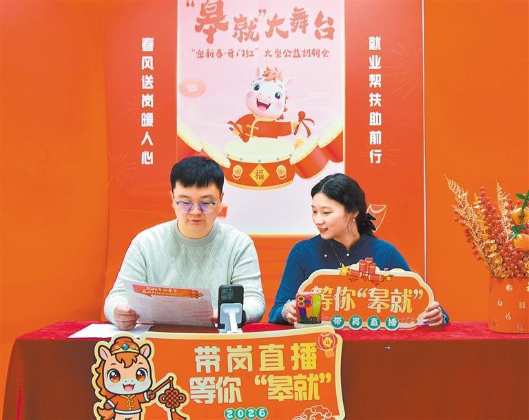 2月27日,江蘇省如皋市2026年“春風(fēng)行動(dòng)”高校畢業(yè)生專場(chǎng)招聘會(huì),工作人員通過(guò)社交平臺(tái)直播招聘信息。吳樹建攝(中經(jīng)視覺(jué))