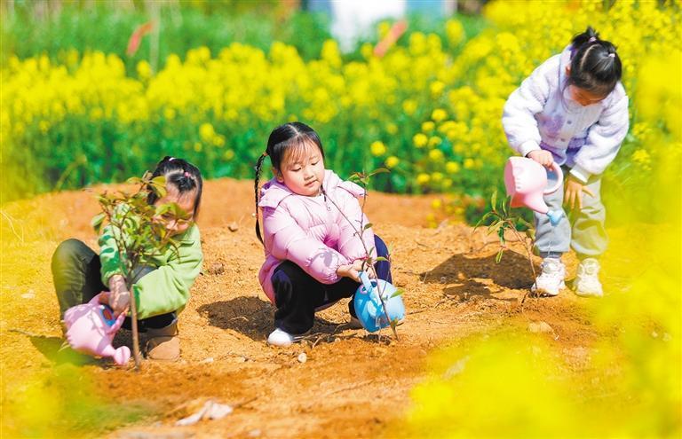 3月11日,江西省吉安市峽江縣城西幼兒園勞動基地,小朋友在為新栽種的樹苗澆水。陳福平攝(中經(jīng)視覺)