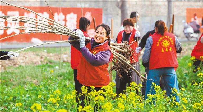 3月11日,河南省焦作市博愛縣柏山鎮(zhèn)大中里村,志愿者在搬運樹苗,準(zhǔn)備種植。程全攝(中經(jīng)視覺)