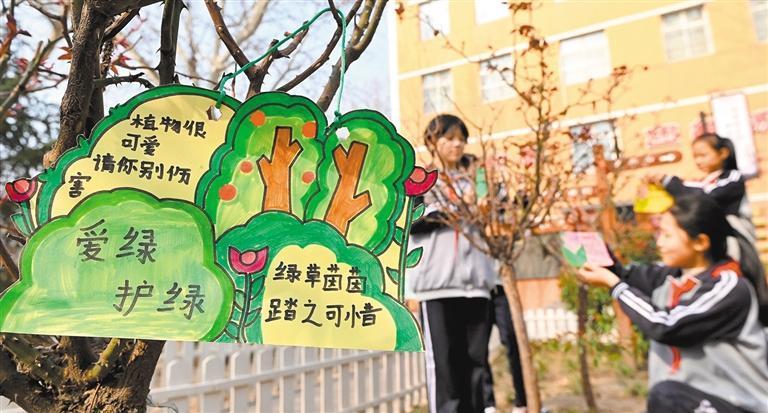 今年3月12日是我國第48個植樹節(jié)。3月12日,河北省邯鄲市復(fù)興區(qū)鐵路小學(xué)學(xué)生在小樹上掛上心愿卡。郝群英攝(中經(jīng)視覺)