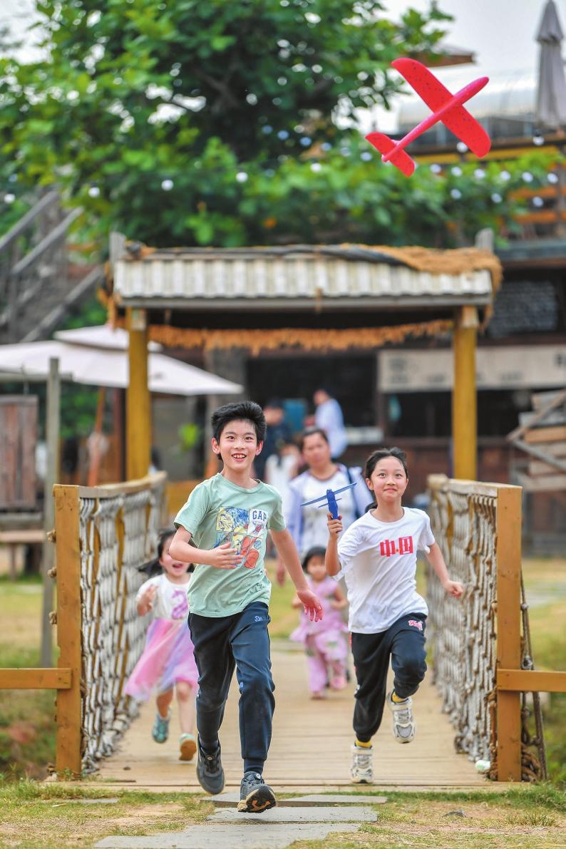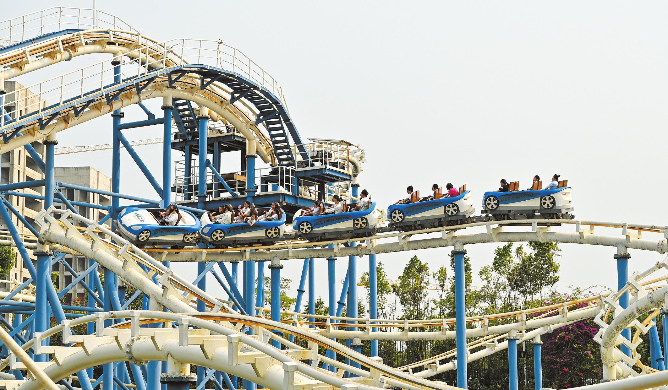 清明假期,海南長(zhǎng)影奇幻樂(lè)園迎來(lái)踏青游玩熱潮。圖為市民游客在體驗(yàn)礦山車(chē)。記者 石中華 攝