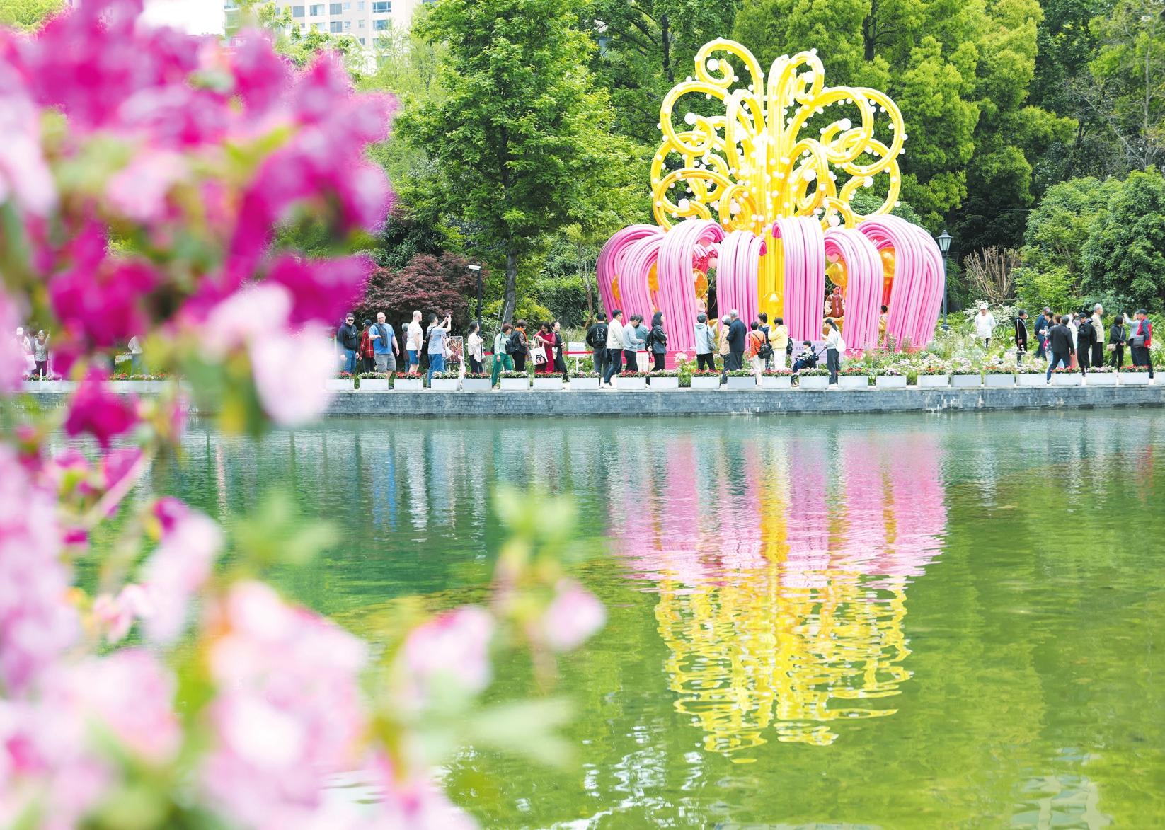 4月18日,游客在上海市黃浦區(qū)新天地太平湖畔賞花。4月18日,以“海上花開,馬上精彩”為主題的2026上海國際花卉節(jié)開幕。本屆花卉節(jié)由上海國際花展升級而來,構(gòu)建“2個主會場+10個分會場+多個城市商圈”的全域布局,把花海搬進商圈、公園與街巷,推動“花卉+文商旅體展”深度融合,探索城市“花經(jīng)濟”消費新場景。 新華社記者 陳浩明 攝