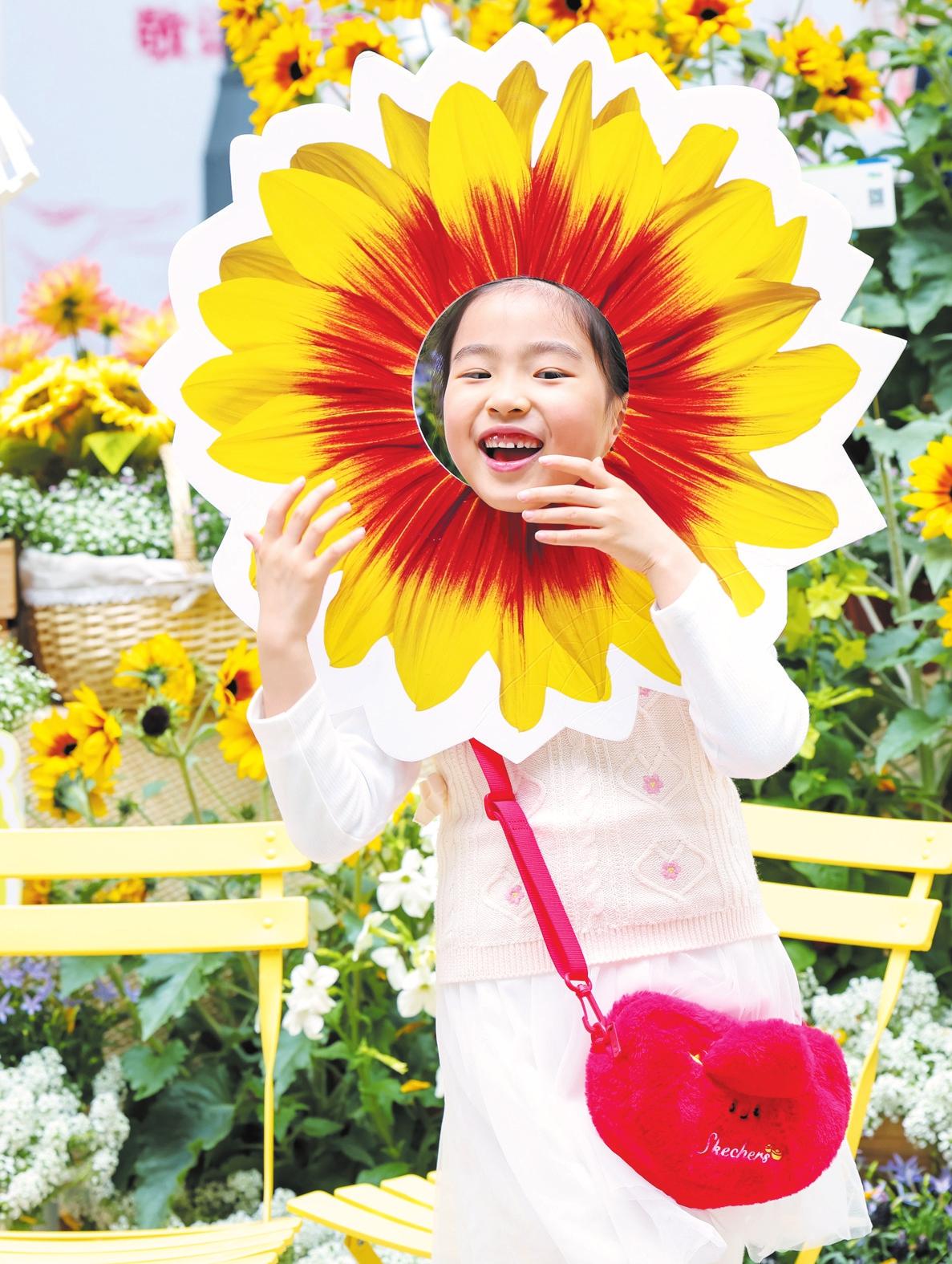 4月18日,小女孩在上海市黃浦區(qū)新天地東臺里舉辦的花卉市集上打卡拍照。 新華社記者 陳浩明 攝