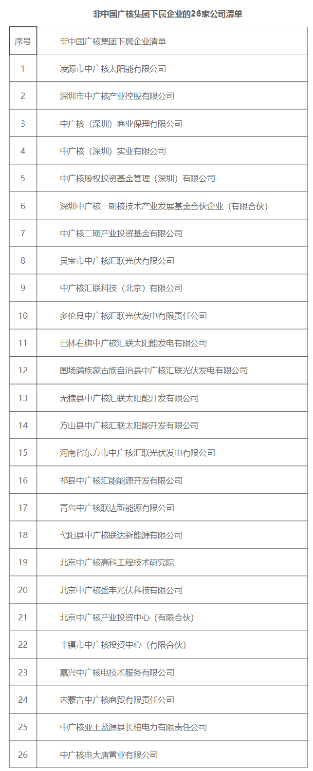 4月份,中廣核發(fā)布公告稱:凌源市中廣核太陽(yáng)能有限公司、深圳市中廣核產(chǎn)業(yè)控股有限公司、嘉興中廣核電技術(shù)服務(wù)有限公司等26家公司在企業(yè)名稱中使用“中廣核”字樣。鑒于該26家公司并非我集團(tuán)下屬企業(yè),鄭重澄清并嚴(yán)正聲明,中國(guó)廣核集團(tuán)未擁有下述26家公司的任何資產(chǎn)或股權(quán),亦無(wú)隸屬或管理關(guān)系,并未授權(quán)下述公司使用“中廣核”商標(biāo)和字號(hào),若因下述公司的經(jīng)營(yíng)行為導(dǎo)致法律、勞務(wù)糾紛或其他相關(guān)責(zé)任,均與我集團(tuán)無(wú)關(guān)。