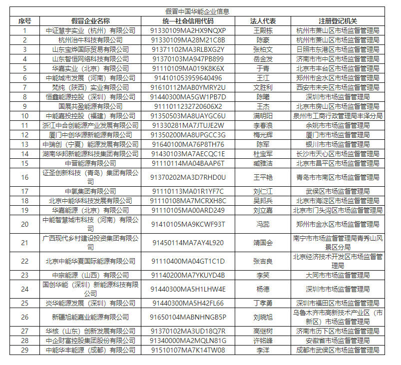 中國(guó)華能稱,發(fā)現(xiàn)不法分子通過(guò)偽造中國(guó)華能集團(tuán)有限公司(以下簡(jiǎn)稱“中國(guó)華能”)所屬企業(yè)證照和印章,在北京、深圳、杭州、鄭州、西安等地工商系統(tǒng)中將29家企業(yè)的股東分別登記為華能(大連)能源熱力有限責(zé)任公司、華能綜合產(chǎn)業(yè)有限公司、華能海外企業(yè)管理有限公司、華能新能源股份有限公司以及天津華能楊柳青熱電實(shí)業(yè)有限公司。