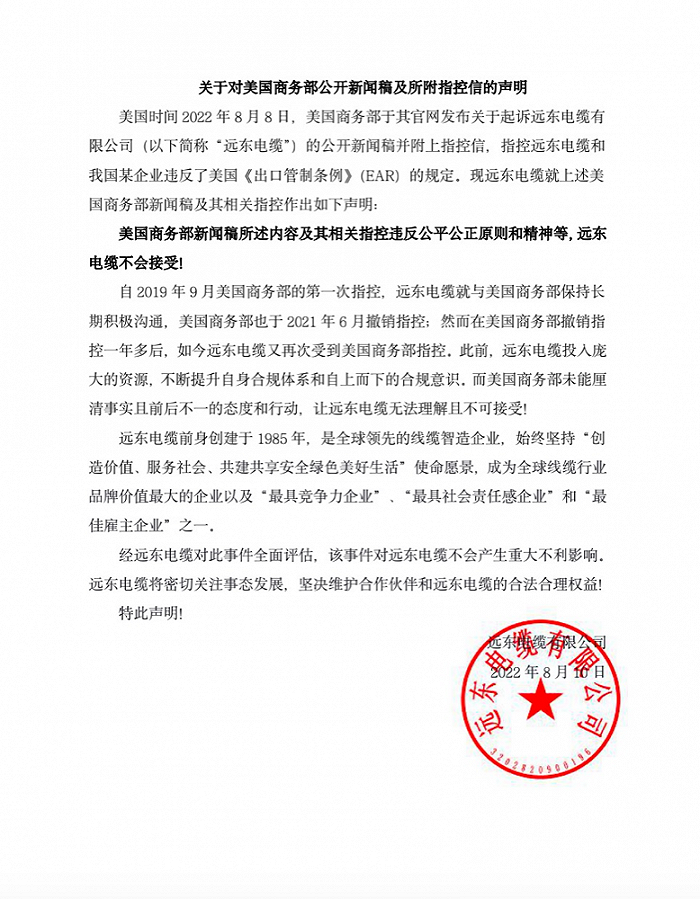 8月11日消息,遠(yuǎn)東電纜有限公司發(fā)布關(guān)于對美國商務(wù)部公開新聞稿及所附指控信的聲明稱,美國商務(wù)部新聞稿所述內(nèi)容及其相關(guān)指控違反公平公正原則和精神等,遠(yuǎn)東電纜不會(huì)接受。