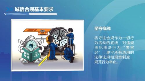 誠信鑄心,合規(guī)立行。中國航發(fā)深入貫徹習(xí)近平法治思想,落實(shí)全面依法治國戰(zhàn)略,始終堅(jiān)持誠信合規(guī)經(jīng)營,以誠信涵養(yǎng)健康產(chǎn)業(yè)生態(tài),以合規(guī)凝聚磅礴發(fā)展動(dòng)力,推動(dòng)航空發(fā)動(dòng)機(jī)事業(yè)高質(zhì)量發(fā)展?!吨袊桨l(fā)誠信合規(guī)準(zhǔn)則》(以下簡(jiǎn)稱《準(zhǔn)則》)作為集團(tuán)合規(guī)管理頂層規(guī)范,為全集團(tuán)誠信合規(guī)經(jīng)營提供了基本的行動(dòng)指南,對(duì)于打造誠信合規(guī)文化、不斷提升集團(tuán)誠信合規(guī)經(jīng)營管理水平具有重要意義。