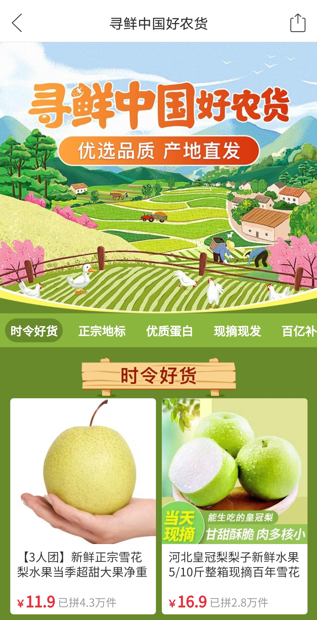 活動(dòng)期間,消費(fèi)者打開(kāi)拼多多app,搜索“尋鮮中國(guó)”“多多好農(nóng)貨”“好農(nóng)貨”等關(guān)鍵詞,即可直達(dá)專區(qū),選購(gòu)時(shí)令地標(biāo)農(nóng)貨。