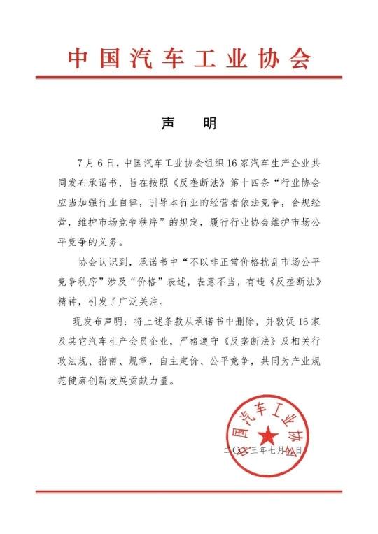 中國汽車工業(yè)協(xié)會(huì)表示,現(xiàn)發(fā)布聲明:將上述條款從承諾書中刪除,并敦促16家及其它汽車生產(chǎn)會(huì)員企業(yè),嚴(yán)格遵守《反壟斷法》及相關(guān)行政法規(guī)、指南、規(guī)章,自主定價(jià)、公平競(jìng)爭(zhēng),共同為產(chǎn)業(yè)規(guī)范健康創(chuàng)新發(fā)展貢獻(xiàn)力量。