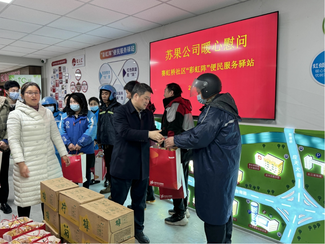 1月18日上午,寒風(fēng)凜冽,蘇果愛(ài)心志愿者團(tuán)隊(duì)來(lái)到南京市雨花臺(tái)區(qū)賽虹橋社區(qū)“彩虹陣”便民服務(wù)驛站,為社區(qū)內(nèi)的外賣(mài)員、快遞員、環(huán)衛(wèi)工人等冬季戶(hù)外工作者送來(lái)保溫桶、姜糖茶、面包、麥片、飲料等關(guān)愛(ài)物資,向他們表示關(guān)懷與敬意?!昂芨袆?dòng),也很感謝來(lái)自蘇果的關(guān)愛(ài),天氣雖冷,但是我們的心確是暖暖的?!碧K果的善意之舉,令戶(hù)外工作者們感受到濃濃的暖意。