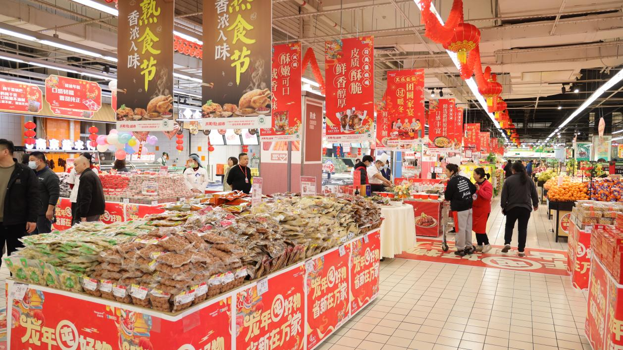 在蘇果南京將軍大道店,喜氣洋洋的龍年年貨節(jié)海報(bào)、吊旗裝飾了整個賣場,各式休閑食品、酒水、牛奶酒水禮盒,鮮活的水產(chǎn)、新鮮的果蔬、來自全國各地的土特產(chǎn)、龍年飾品、吉祥物等琳瑯滿目,蘇果超市“年貨節(jié)”呈現(xiàn)一片紅火和欣欣向榮的熱鬧景象。不少消費(fèi)者推著購物車提前選購心儀的年貨和伴手禮?!懊磕甑倪@個時候家里都會提前備年貨和福字紅包等年節(jié)商品,錯開節(jié)前一周的購買高峰?!笔忻裰馨⒁瘫硎?。