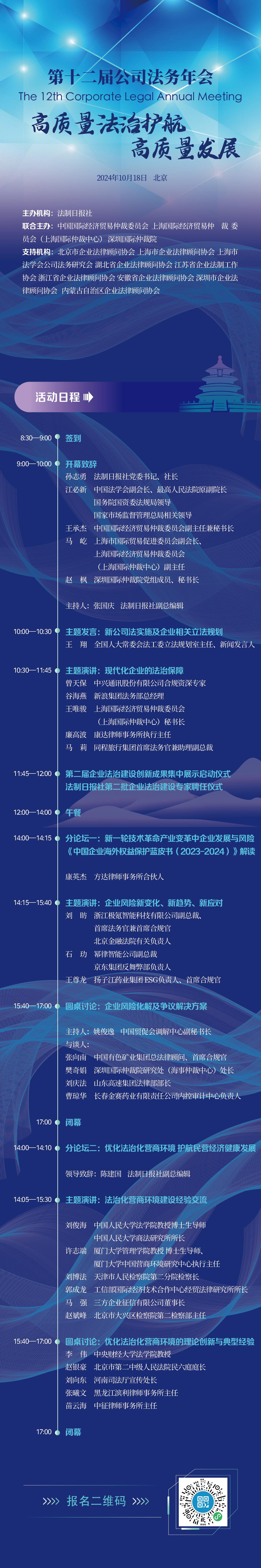 2024年是實現(xiàn)“十四五”規(guī)劃目標任務的關鍵一年。面對新一輪科技革命和產(chǎn)業(yè)變革,企業(yè)在迎來發(fā)展新機遇的同時,也面臨著數(shù)據(jù)安全治理、知識產(chǎn)權保護、反壟斷、出口管制、經(jīng)濟制裁等諸多法律風險和挑戰(zhàn)。為此,法制日報社將舉辦“第十二屆公司法務年會(北京)”活動,旨在共同探尋企業(yè)在法治軌道上實現(xiàn)高質量發(fā)展的路徑和策略,推動企業(yè)在以中國式現(xiàn)代化全面推進強國建設、民族復興偉業(yè)中作出更大貢獻。