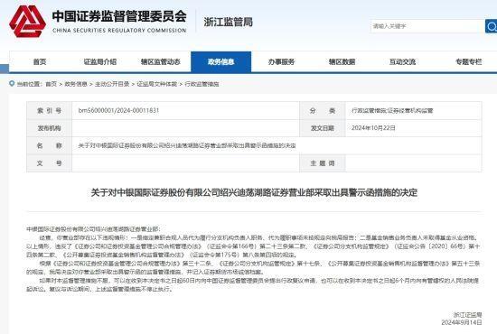 根據(jù)《證券公司和證券投資基金管理公司合規(guī)管理辦法》第三十二條、《證券公司分支機(jī)構(gòu)監(jiān)管規(guī)定》第十七條、《公開募集證券投資基金銷售機(jī)構(gòu)監(jiān)督管理辦法》第五十三條的規(guī)定,浙江證監(jiān)局決定對中銀證券紹興迪蕩湖路證券營業(yè)部采取出具警示函的監(jiān)督管理措施,并記入證券期貨市場誠信檔案。