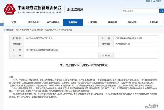 孫霞作為中銀證券紹興迪蕩湖路證券營業(yè)部現(xiàn)任負(fù)責(zé)人,對該營業(yè)部上述問題負(fù)有直接責(zé)任,根據(jù)《證券公司和證券投資基金管理公司合規(guī)管理辦法》第三十二條、《公開募集證券投資基金銷售機(jī)構(gòu)監(jiān)督管理辦法》第五十三條的規(guī)定,浙江證監(jiān)局決定對孫霞采取出具警示函的監(jiān)督管理措施,并記入證券期貨市場誠信檔案。