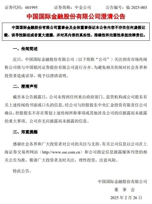 2月26日晚間,中金公司發(fā)布澄清公告稱(chēng):“近日,公司關(guān)注到有市場(chǎng)傳聞稱(chēng)公司將與中國(guó)銀河進(jìn)行合并。截至本公告披露日,公司未得到任何來(lái)自政府部門(mén)、監(jiān)管機(jī)構(gòu)或公司股東有關(guān)上述傳聞的書(shū)面或口頭的信息。”