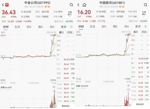 2月26日午后,中金公司和中國(guó)銀河合并傳聞再起,兩家公司股價(jià)雙雙異動(dòng),其中兩家公司A股股價(jià)均在半小時(shí)內(nèi)快速漲停,中金公司A股收?qǐng)?bào)36.43元/股,中國(guó)銀河A股收?qǐng)?bào)16.2元/股;港股方面,中金公司收?qǐng)?bào)16.22港元/股,漲19.09%;中國(guó)銀河收?qǐng)?bào)8.76港元/股,漲17.11%。