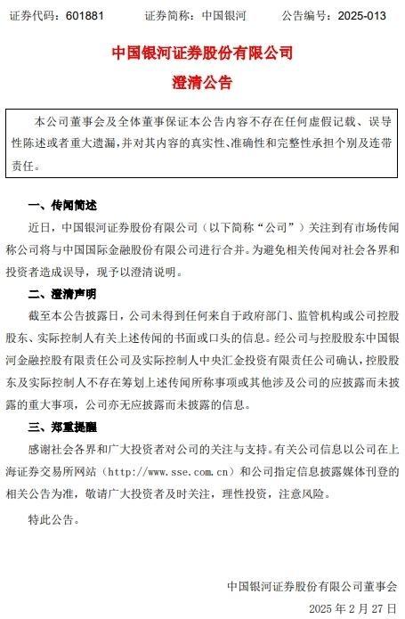 中國(guó)國(guó)際金融股份有限公司(下稱(chēng)“中金公司”,601995.SH,03908.HK)與中國(guó)銀河證券股份有限公司(下稱(chēng)“中國(guó)銀河”,601881.SH,06881.HK)雙雙否認(rèn)合并傳聞。