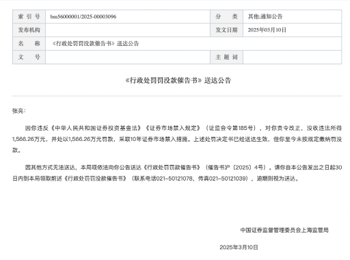 公告內(nèi)容顯示,張亮因違反《中華人民共和國證券投資基金法》《證券市場禁入規(guī)定》,被責令改正,并被沒收違法所得1566.26萬元,以及被處以1566.26萬元罰款,被采取10年證券市場禁入措施。