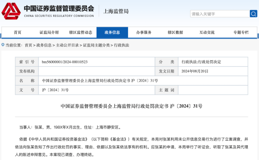上海證監(jiān)局彼時表示,張某應(yīng)自收到該處罰決定書之日起15日內(nèi),將罰沒款匯交中國證監(jiān)會,由該行直接上繳國庫。到期不繳納罰款的,上海證監(jiān)局可以每日按罰款數(shù)額的百分之三加處罰款。