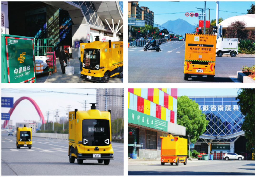 ▲在安徽省南陵縣道路上行駛的無(wú)人快遞車,實(shí)現(xiàn)從快遞終點(diǎn)站到小區(qū)快遞驛站“最后一公里”的快遞轉(zhuǎn)運(yùn)。受訪者供圖
