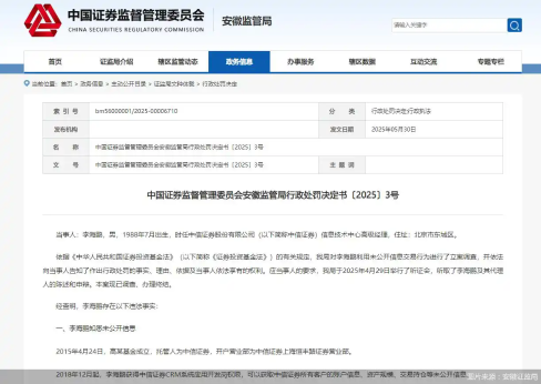 5月30日,安徽證監(jiān)局發(fā)布公告指出,時(shí)任中信證券信息技術(shù)中心高級(jí)經(jīng)理李海鵬存在違法行為,其獲得中信證券CRM系統(tǒng)應(yīng)用開發(fā)崗權(quán)限,可以獲取中信證券所有客戶的賬戶信息、資產(chǎn)規(guī)模、交易持倉等未公開信息。2019年11月1日至2023年2月21日,李海鵬通過CRM系統(tǒng),獲知高某基金的持倉、委托、當(dāng)日成交記錄等未公開信息,其利用未公開信息違規(guī)交易股票,同時(shí)存在趨同交易的情況。安徽證監(jiān)局決定,沒收李海鵬違法所得213.14萬元,并處以213.14萬元罰款。