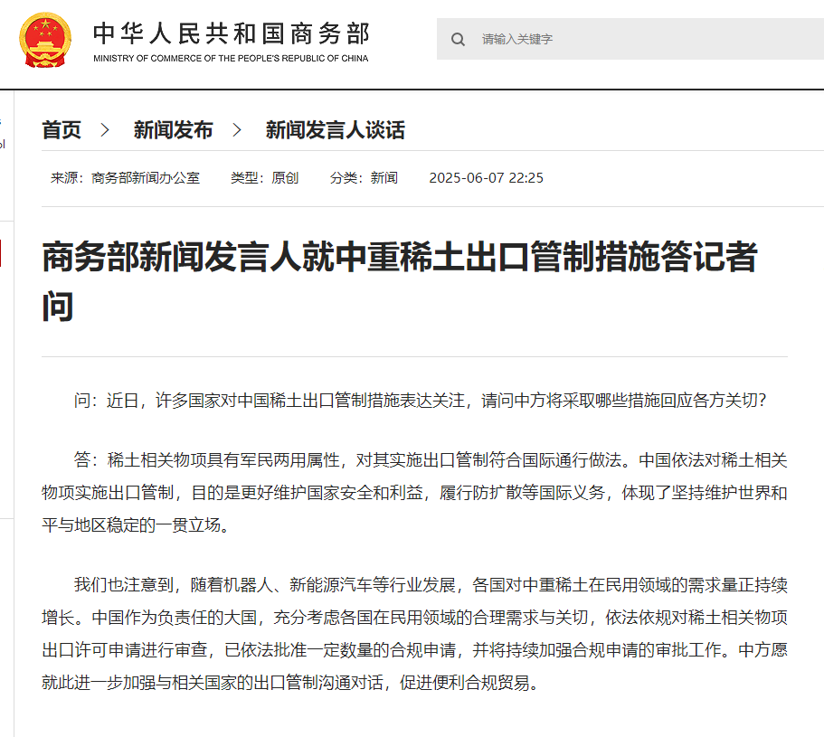 我們也注意到,隨著機(jī)器人、新能源汽車等行業(yè)發(fā)展,各國對(duì)中重稀土在民用領(lǐng)域的需求量正持續(xù)增長。中國作為負(fù)責(zé)任的大國,充分考慮各國在民用領(lǐng)域的合理需求與關(guān)切,依法依規(guī)對(duì)稀土相關(guān)物項(xiàng)出口許可申請(qǐng)進(jìn)行審查,已依法批準(zhǔn)一定數(shù)量的合規(guī)申請(qǐng),并將持續(xù)加強(qiáng)合規(guī)申請(qǐng)的審批工作。中方愿就此進(jìn)一步加強(qiáng)與相關(guān)國家的出口管制溝通對(duì)話,促進(jìn)便利合規(guī)貿(mào)易。