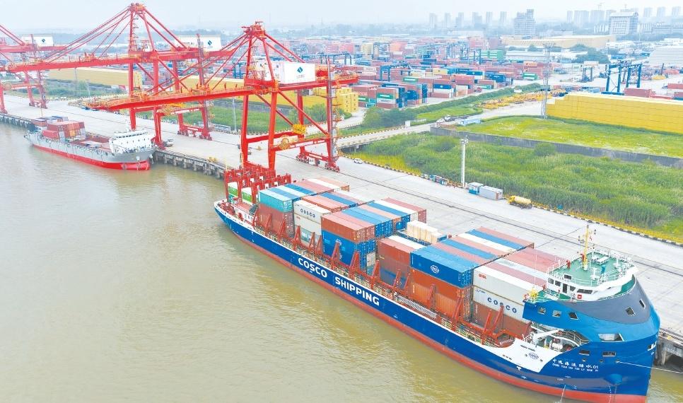 海關(guān)總署9日發(fā)布數(shù)據(jù)顯示,今年前5個(gè)月我國貨物貿(mào)易進(jìn)出口同比增長2.5%。圖為9日當(dāng)天的南京港龍?zhí)陡蹍^(qū)。(視覺中國)
