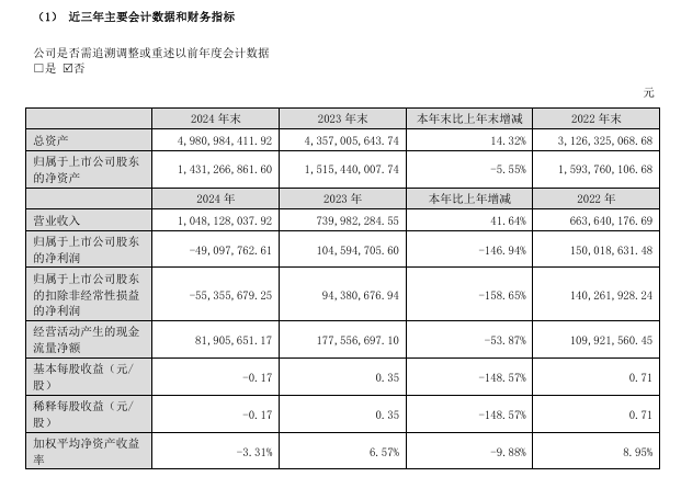 2024年,廣聯(lián)航空實(shí)現(xiàn)營(yíng)業(yè)收入10.48億元,同比增長(zhǎng)41.64%;歸屬于上市公司股東的凈利潤(rùn)虧損4909.78萬(wàn)元,由盈轉(zhuǎn)虧。