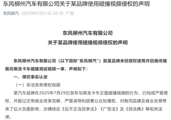 7月31日晚間,東風(fēng)柳州汽車有限公司(簡(jiǎn)稱“東風(fēng)柳汽”)發(fā)布關(guān)于某品牌未經(jīng)授權(quán)使用并扭曲傳播東風(fēng)柳汽旗下商用車品牌乘龍卡車碰撞視頻侵權(quán)的聲明。