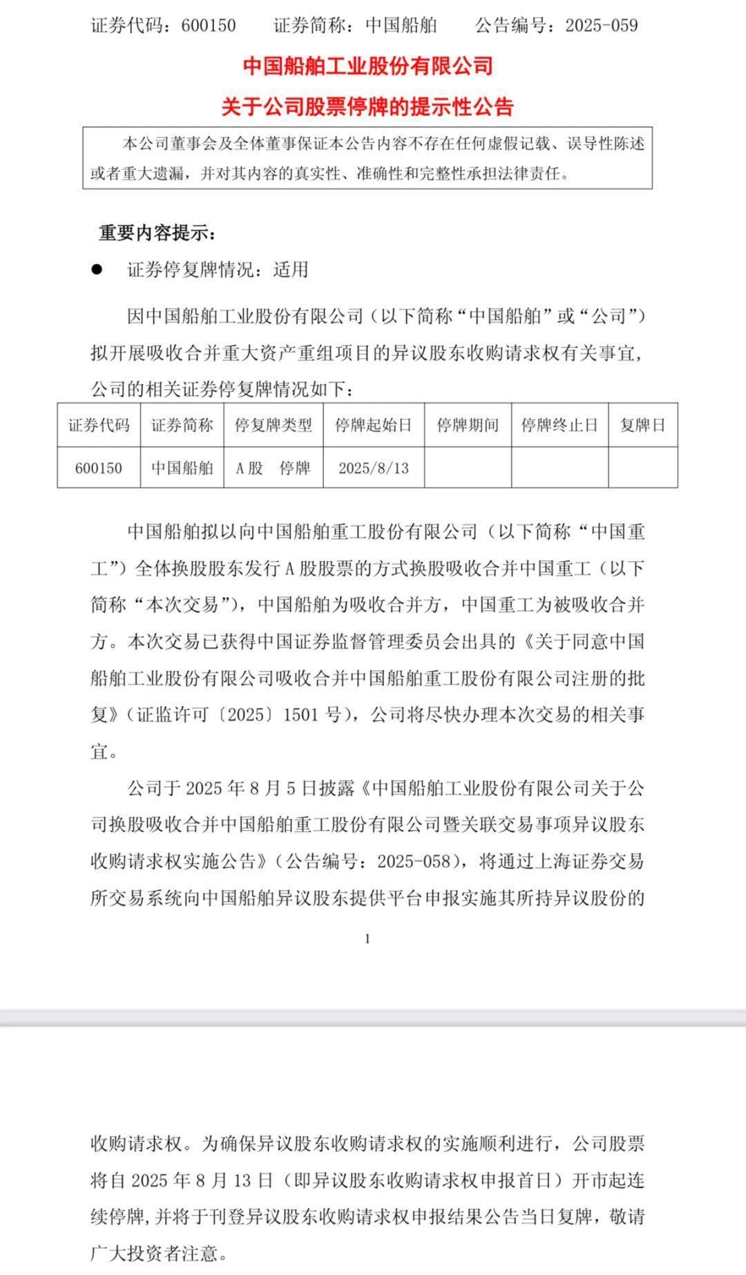 8月4日晚間,中國船舶發(fā)布公告稱,公司擬開展吸收合并重大資產(chǎn)重組項目的異議股東收購請求權(quán)有關(guān)事宜,公司股票將自2025年8月13日開市起連續(xù)停牌,并將于刊登異議股東收購請求權(quán)申報結(jié)果公告當日復牌。
