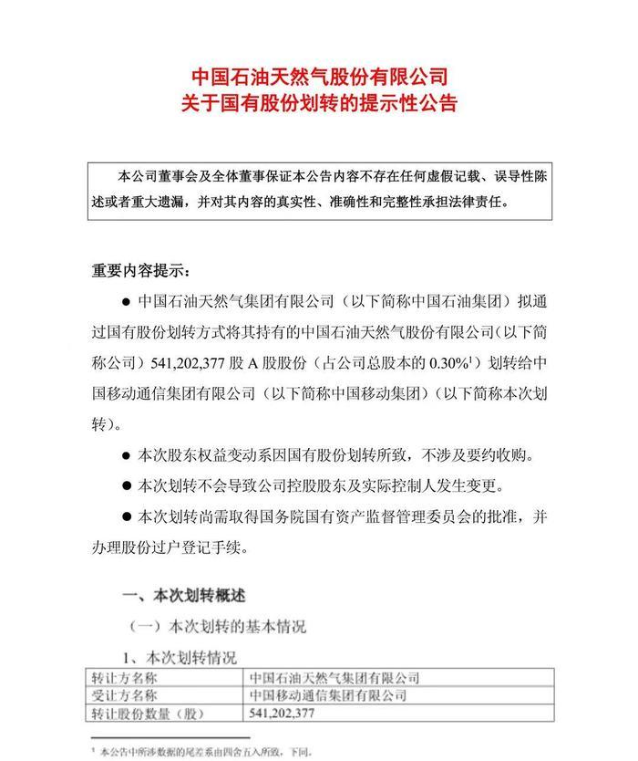 公告顯示,本次劃轉(zhuǎn)前,中國(guó)石油集團(tuán)直接持有公司150,923,565,570股A股股份,占公司總股本的82.46%,通過(guò)境外全資附屬公司Fairy King InvestmentsLtd.間接持有公司291,518,000股H股股份,占公司總股本的0.16%。中國(guó)移動(dòng)集團(tuán)通過(guò)附屬公司中國(guó)移動(dòng)通信有限公司持有公司178,794,300股,占公司總股本的0.10%。