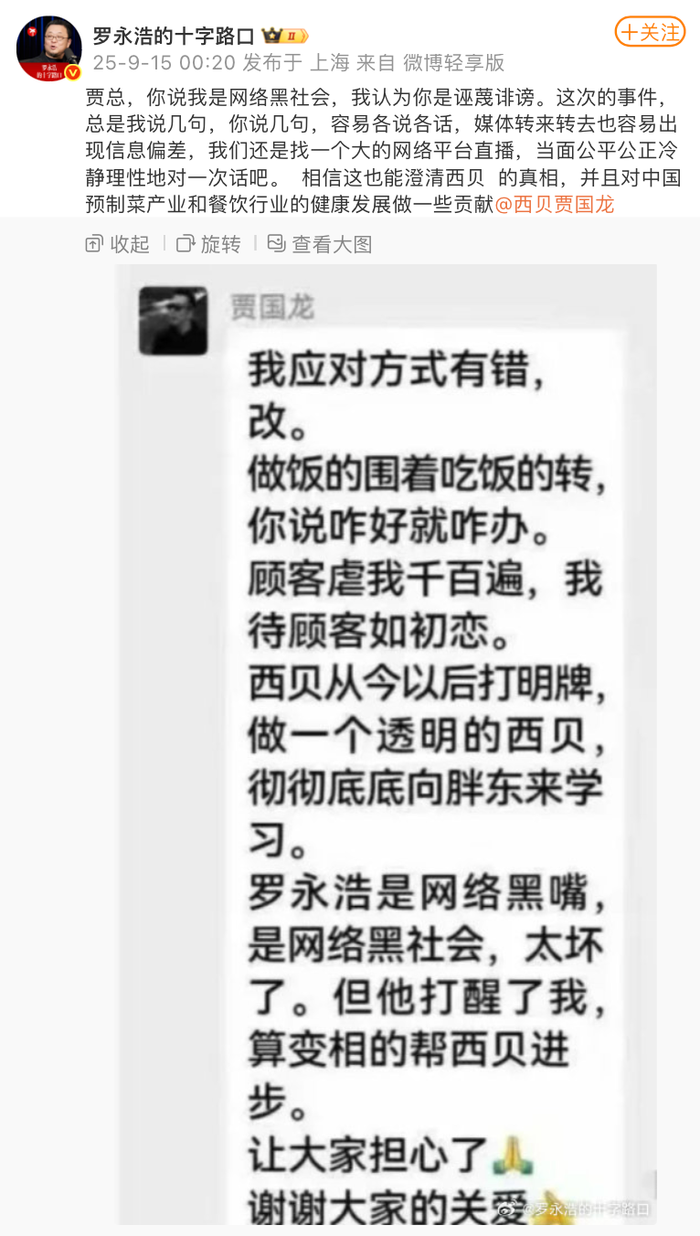 近日,西貝餐飲與羅永浩就預(yù)制菜引發(fā)的爭論在網(wǎng)絡(luò)上持續(xù)發(fā)酵。14日晚間,西貝創(chuàng)始人賈國龍此前表態(tài)的完整截圖流出,其中除了提到西貝從今以后要打明牌、向胖東來學(xué)習(xí)外,還將羅永浩稱為網(wǎng)絡(luò)黑嘴、網(wǎng)絡(luò)黑社會。對此,羅永浩今日凌晨在社交平臺表示,本次事件中雙方總是各說各話,媒體轉(zhuǎn)來轉(zhuǎn)去也容易出現(xiàn)信息偏差。他提議,雙方找一個大型網(wǎng)絡(luò)平臺直播,當面對話。