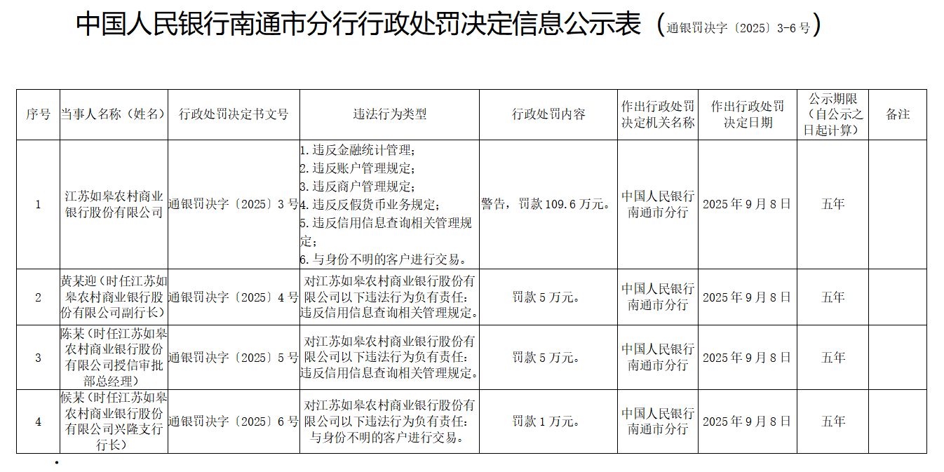 9月16日,中國人民銀行江蘇省分行網(wǎng)站發(fā)布的一則行政處罰信息顯示,江蘇如皋農(nóng)村商業(yè)銀行股份有限公司(以下簡稱“如皋農(nóng)商銀行”)因存在多項業(yè)務(wù)違規(guī)行為,被中國人民銀行南通市分行給予警告,并處以109.6萬元罰款。同時,該行3名相關(guān)責任人也受到處罰。