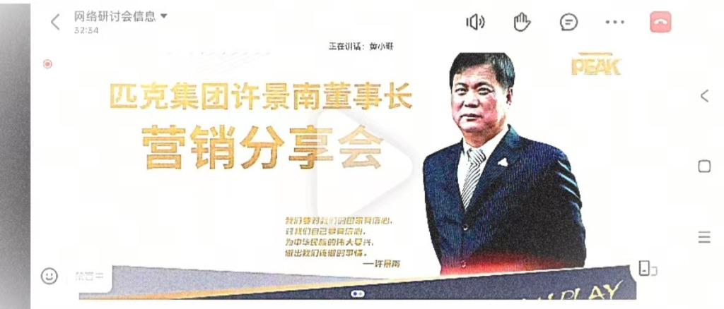 多位員工介紹,9月17日上午的分享會,對外通知為關于三觀培訓和加強內(nèi)控管理。主講人為董事長許景南,參會人員顯示為公司各單位主管級及以上人員、生產(chǎn)公司車間主任級及以上人員必須現(xiàn)場參加,也歡迎其他員工在合理安排工作下積極參與。談及管理分享會,多位員工表示,內(nèi)部稱之為“三觀培訓會”,匹克通常一周到兩周開一次,由董事長一個人主講,一般要求管理人員參加,在總部的現(xiàn)場參加,外地的線上參會,開會時長基本為半天。