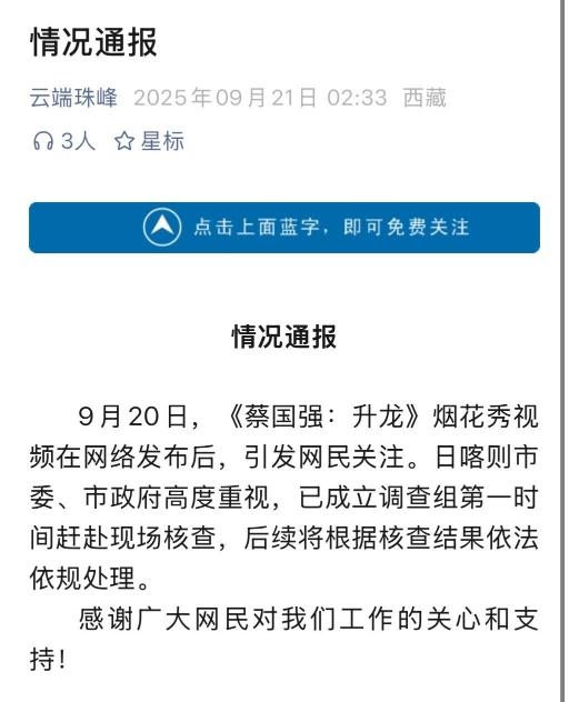 蔡國強煙花秀引發(fā)關注,日喀則通報:已成立調(diào)查組趕赴現(xiàn)場核查