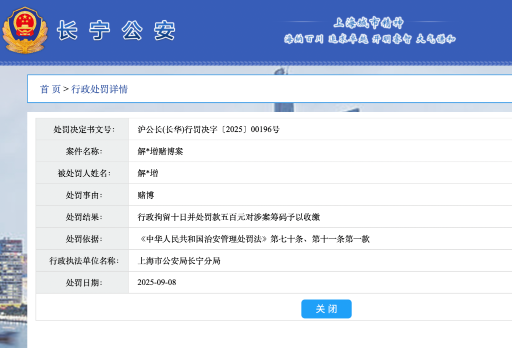 上海市公安局長寧分局官網(wǎng)公開的行政處罰信息顯示,9月8日,一位姓名為“解某增”的人員因參與賭博被上海市警方帶走,處罰結(jié)果為“行政拘留十日,并處罰款五百元,對涉案籌碼予以收繳”。