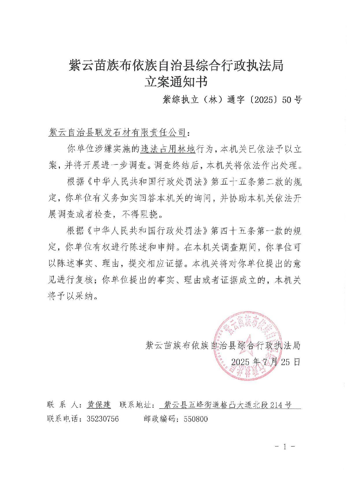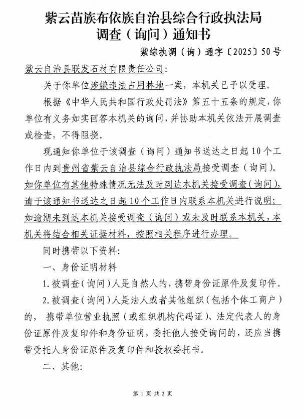 因你公司涉嫌在貴州省紫云自治縣貓營鎮(zhèn)普卡橋村違法占用林地一案,我機(jī)關(guān)依法向你公司公告送達(dá)《立案通知書》【紫綜執(zhí)立(林)通字〔2025〕50號】及《調(diào)查(詢問)通知書》【紫綜執(zhí)調(diào)(詢)通字〔2025〕50號】。請于本公告送達(dá)之日起10個(gè)工作日內(nèi)到本機(jī)關(guān)接受調(diào)查、詢問(地址:貴州省紫云自治縣五峰街道格凸大道北段214號;電話:0851-35230756),進(jìn)行陳述、申辯。逾期未聯(lián)系本機(jī)關(guān),本機(jī)關(guān)將依法處理。如對公告送達(dá)方式有異議,請于本公告發(fā)布之日起7個(gè)工作日內(nèi)提出異議,若逾期未提出異議,上述文書自本公告發(fā)出之日起三十日,即視為送達(dá)。(見本公告后請聯(lián)系本機(jī)關(guān)簽收上述文書)