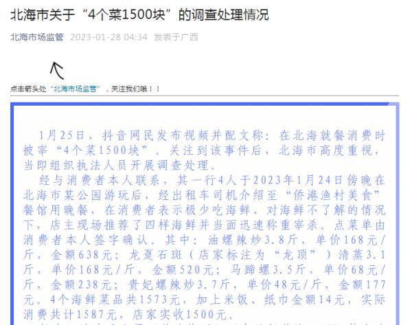 1月28日,廣西北海市市場監(jiān)督管理局微信公眾號發(fā)布《北海市關(guān)于“4個(gè)菜1500塊”的調(diào)查處理情況》,其中提到: