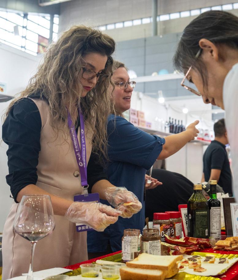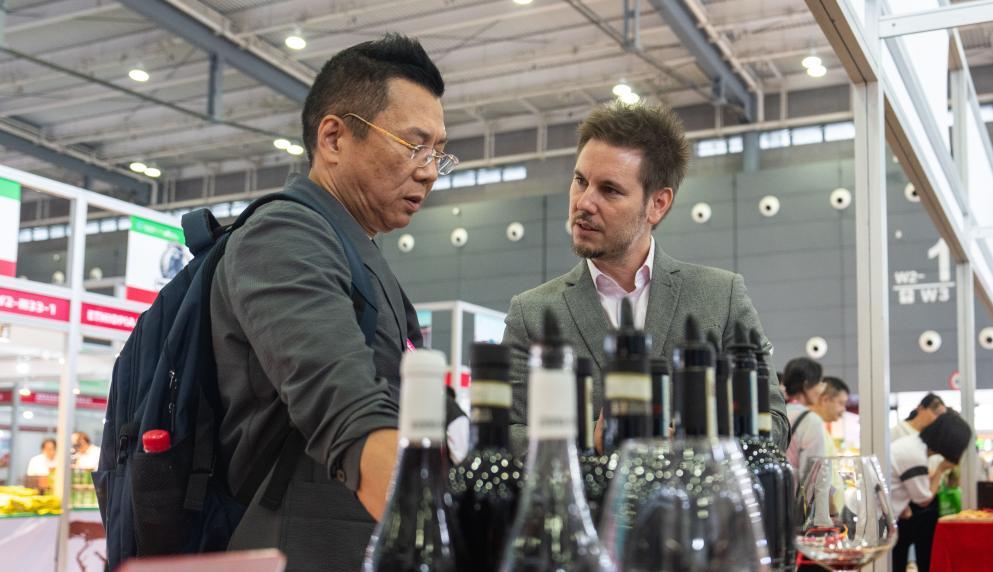 9月19日,在長沙國際會展中心,參展商(右)在介紹展出的紅酒。新華社記者 陳思汗 攝