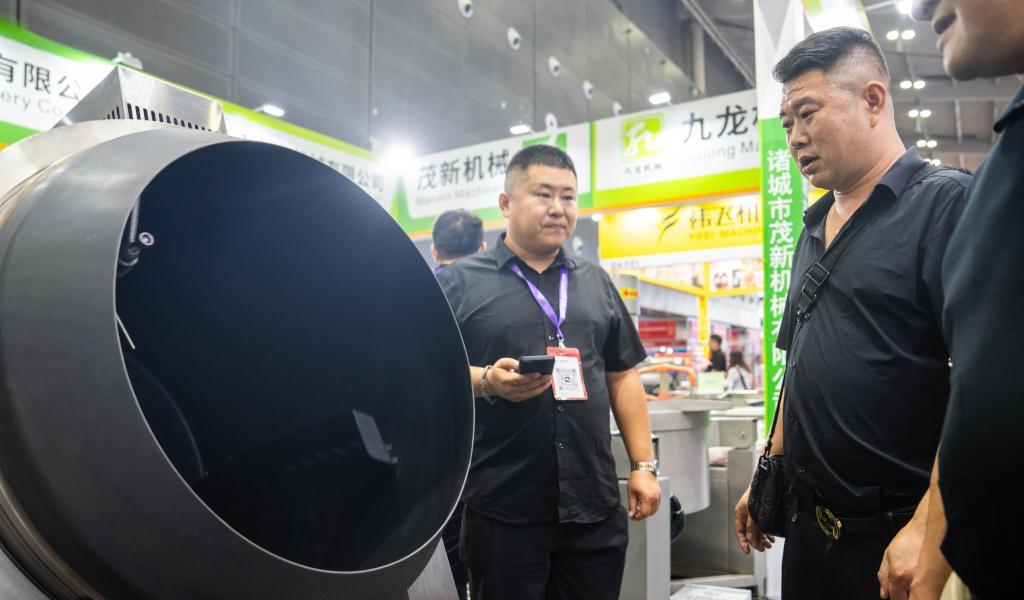 9月19日,在長沙國際會展中心,觀眾(右)在了解商用炒菜設備。新華社記者 陳思汗 攝